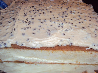 Finally, here's the inside layer of my Handy Manny Toolbox Cake. I thinned out the cookie dough recipe with whole milk to make it spreadable (and to have more of a frosting consistency). I only had the chocolate chips in the middle layer since I was covering the cake with my homemade fondant. I didn't want the toolbox to be bumpy.
